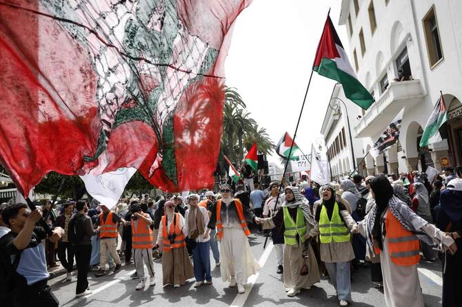 An estimated 5,000 demonstrators gathered along Mohammed V Avenue, waving Palestinian and Moroccan flags while chanting slogans against the death penalty and Israel’s ongoing military operations in Gaza.